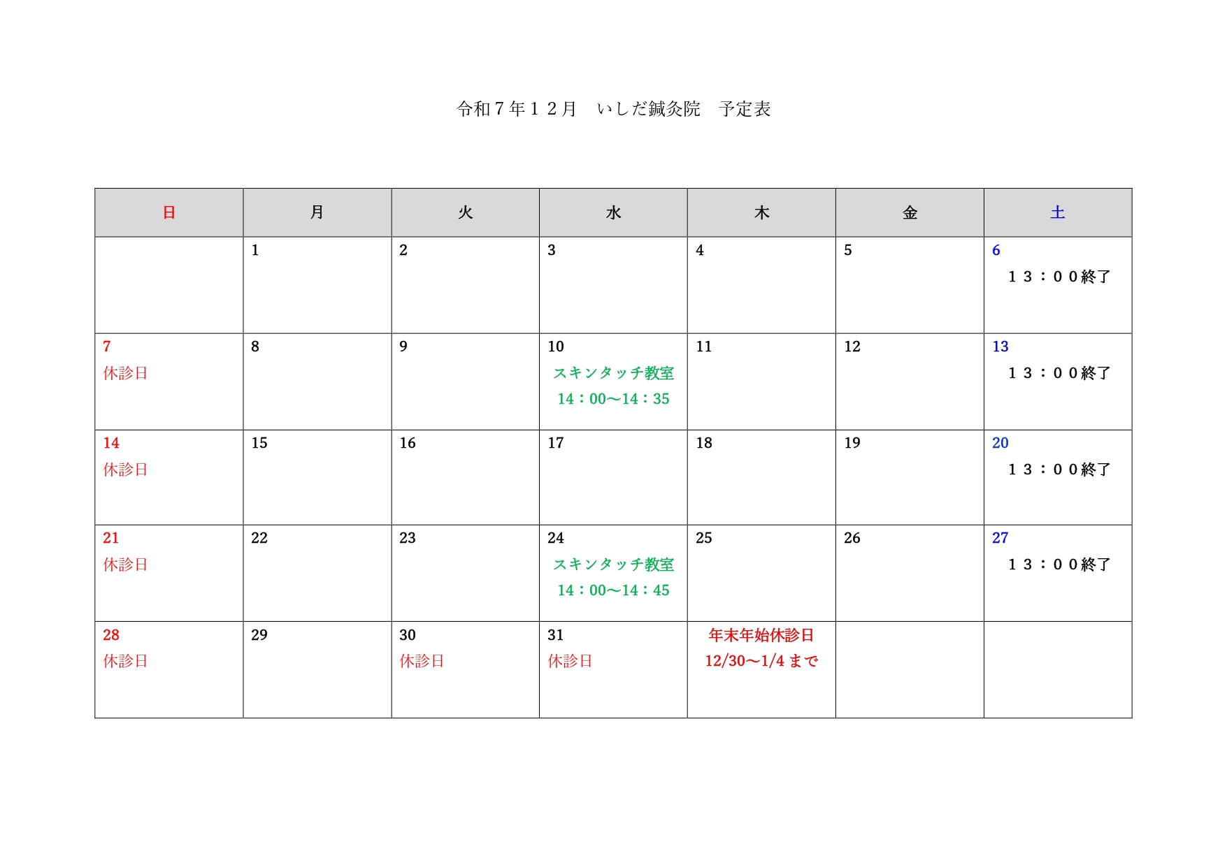 年末年始休診日は、12/30(火)~1/4(日)です。 1/5(月)からは通常通りの施術時間となります。